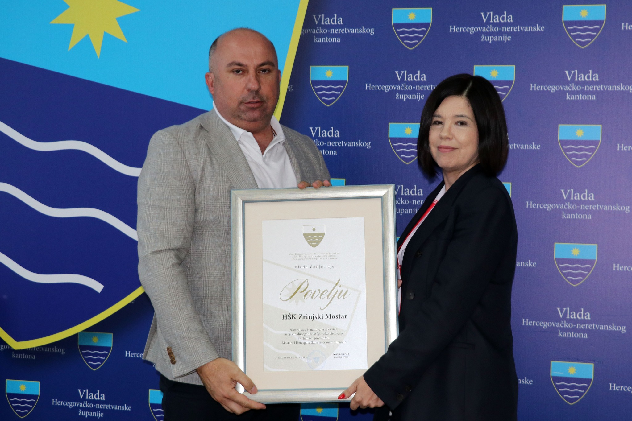 Povod prijema bilo je osvajanje devetog naslova prvaka BiH, a u znak priznanja za ovaj veliki uspjeh, kao i za dugogodišnji kontinuitet uspješnih sportskih rezultata te izniman doprinos promociji Mostara i Hercegovačko-neretvanske županije, predsjednica Buhač uručila je HŠK Zrinjski Povelju Vlade HNŽ-a.